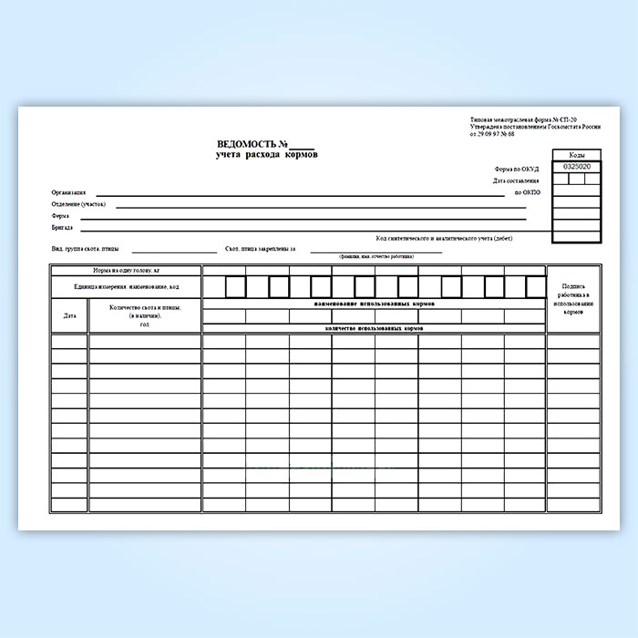 Форма Журнала учета расхода кормов (Форма № СП-20) соответствует Постановлению Госкомстата РФ от 29.09.1997 № 68 " Об утверждении унифицированных форм первичной учетной документации по учету сельскохозяйственной продукции и сырья"