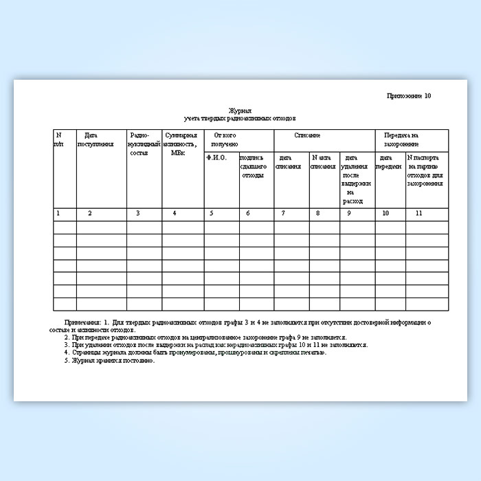 Форма Журнала учета твердых радиоактивных отходов соответствует Приложению 10 к СанПиН 2.6.1.2368-08. «Гигиенические требования по обеспечению радиационной безопасности при проведении лучевой терапии с помощью открытых радионуклидных источников» от 16 июня 2008 .