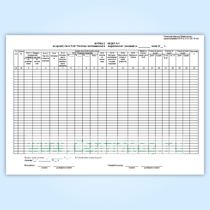 Журнал-ордер № 5 по кредиту счета № 60 "Расчеты с поставщиками и подрядчиками" (сводный) Утвержден приказом Министерства здравоохранения СССР от 31.03.1987 № 468.