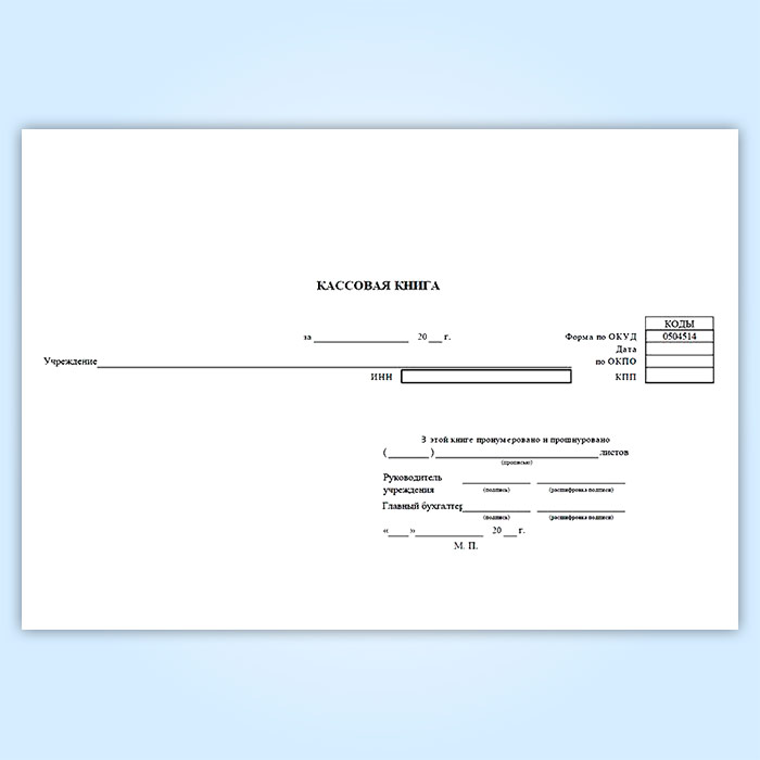 Форма кассовой книги утверждена Приказом Минфина России от 30.03.2015 N 52н " Об утверждении форм первичных учетных документов и регистров бухгалтерского учета, применяемых органами государственной власти (государственными органами), органами местного самоуправления, органами управления государственными внебюджетными фондами, государственными (муниципальными) учреждениями, и Методических указаний по их применению", а также Приказу Министерства финансов Российской Федерации (Минфин России) от 15 декабря 2010 г. N 173н г. Москва "Об утверждении форм первичных учетных документов и регистров бухгалтерского учета, применяемых органами государственной власти (государственными органами), органами местного самоуправления, органами управления государственными внебюджетными фондами, государственными академиями наук, государственными (муниципальными) учреждениями и Методических указаний по их применению