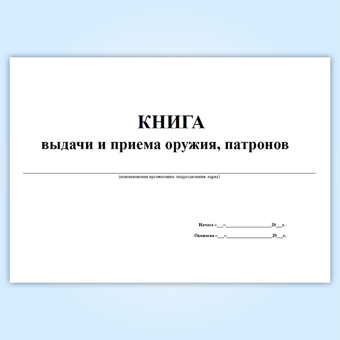 Книга выдачи и приема оружия, патронов соответствует Приложению № 3 к Инструкции о порядке учета, хранения, выдачи, использования и транспортировки ведомственной охраной Министерства финансов Российской Федерации служебного огнестрельного и боевого ручного стрелкового оружия, патронов к нему и специальных средств, утвержденной приказом Министерства финансов Российской Федерации от 25 сентября 2015 г.№ 151н, а также Приложению № 61 к Инструкции по работе органов внутренних дел по контролю за оборотом гражданского и служебного оружия и патронов к нему