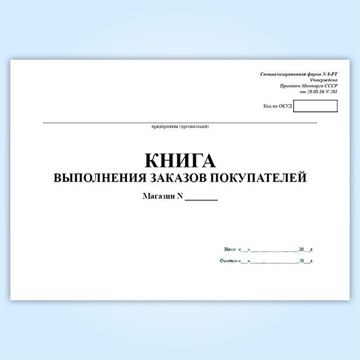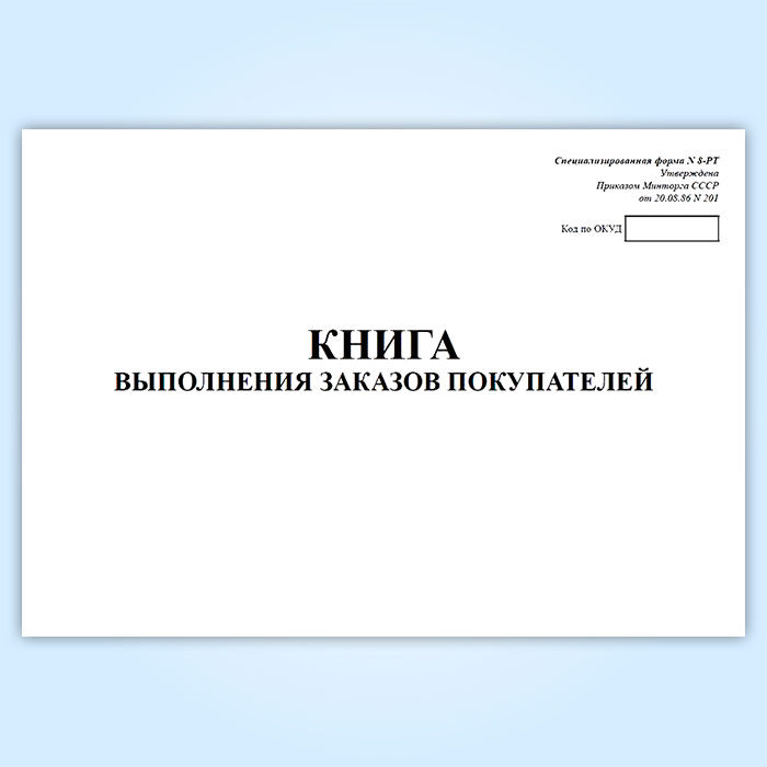 Форма книги выполнения заказов покупателей № 8-РТ утверждена Приказом Минторга СССР от 20.08.86 № 201