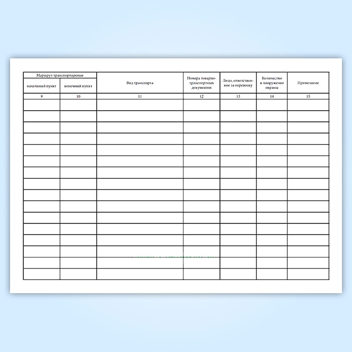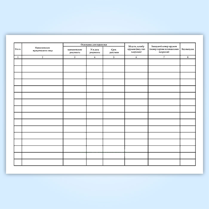 Книга учета перевозок оружия и патронов содержит следующие графы: