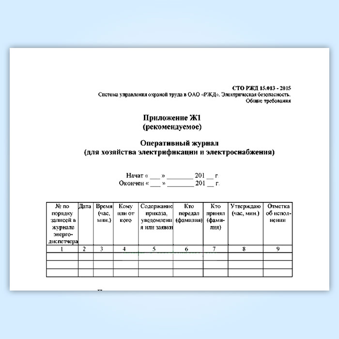 Форма оперативного журнала (для хозяйства электрификации и электроснабжения) соответствует Приложению Ж1 к СТО РЖД 15.013-2015 «Система управления охраной труда в OAO «РЖД». Электрическая безопасность. Общие положения».