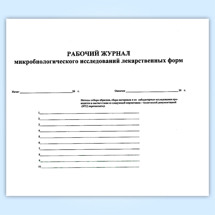 Рабочий журнал микробиологического исследований лекарственных форм ведется в одном экземпляре, прошнуровывается, пронумеровывается, скрепляется печатью и заверяется подписью ответственного лица за делопроизводство.