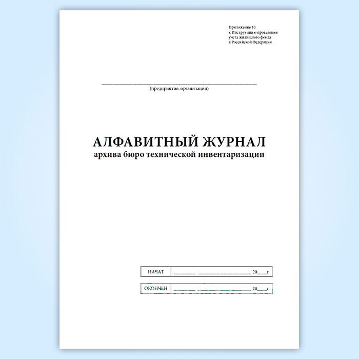 Форма алфавитного журнала архива бюро технической инвентаризации соответствует приложению 10 к Инструкции о проведении учета жилищного фонда в Российской Федерации.