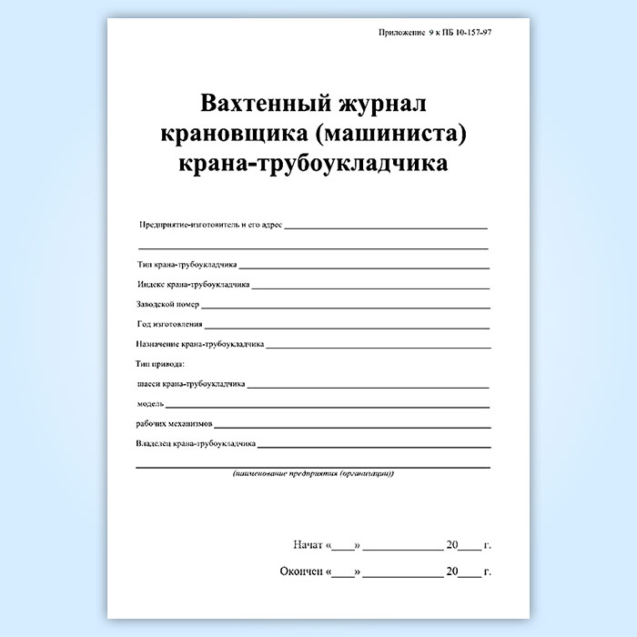 Форма Вахтенного журнала крановщика (машиниста) крана-трубоукладчика соответствует Приложению 9, которое утверждено Постановлением Госгортехнадзора России ПБ 10-157-97 № 44 «Правила устройства и безопасной эксплуатации кранов-трубоукладчиков» от 20.11.97. Оно не действует, т.к. в него были внесены изменения, утвержденные и введенные в действие с 28.10.2008 Приказом ростехнадзора от 28 октября 2008 года № 849-а «О внесении изменений в Правила устройства и безопасной эксплуатации кранов-трубоукладчиков, Правила устройства и безопасной эксплуатации грузоподъемных кранов».