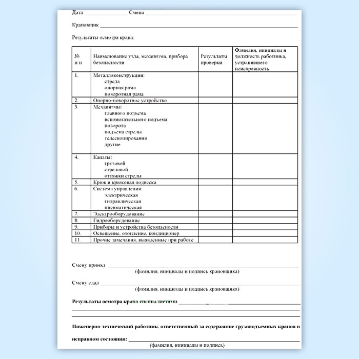 Результаты осмотра и проверки кранов крановщиками должны записываться в вахтенный журнал крановщика автомобильного крана.