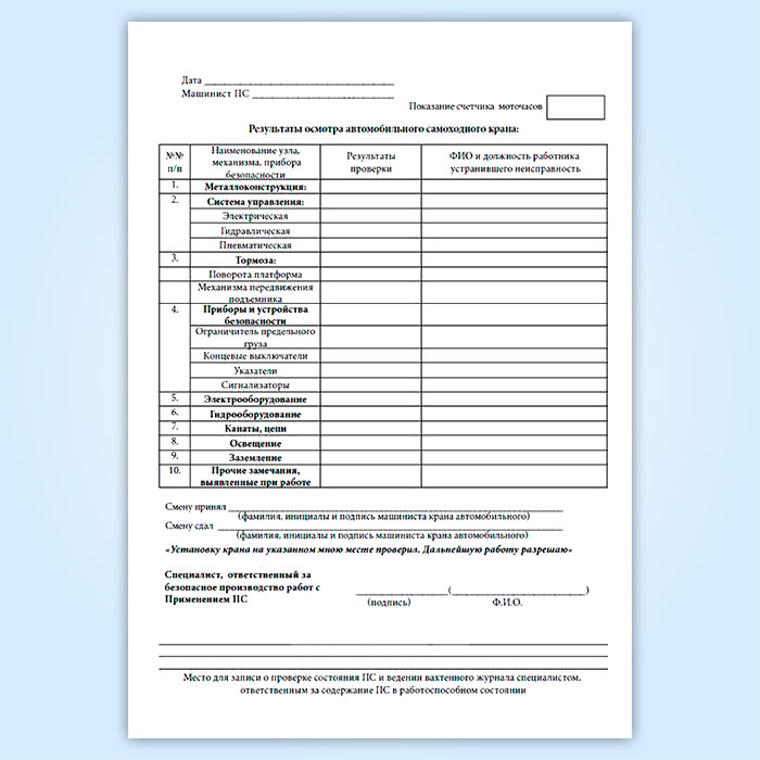 Вахтенный журнал машиниста автомобильного стрелового крана
