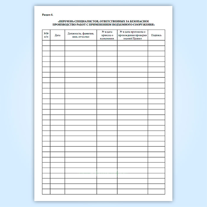 5. Раздел 4. Записи машинистов о результатах осмотра и проверки подъемного сооружения перед началом и по окончании работы