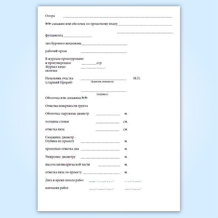 В журнал вносятся данные при выполнении работ по: бурению скважин, в том числе в основании оболочек;