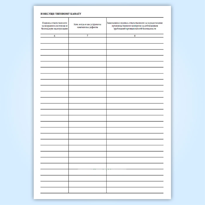 Форма журнала осмотра и ремонта канатной дороги. Натяжной канат к тяговому и несуще-тяговому канату (форма №4) соответствует Приложению 6 к Приказу Ростехнадзора от 13.11.2020 N 441 "Об утверждении федеральных норм и правил в области промышленной безопасности "Правила безопасности пассажирских канатных дорог и фуникулеров".