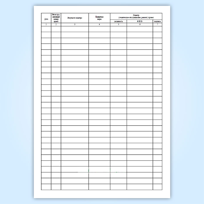 Форма журнала осмотра, технического обслуживания и ремонта грузоподъемных кранов соответсвует Федеральным нормам и правила в области промышленной безопасности.
