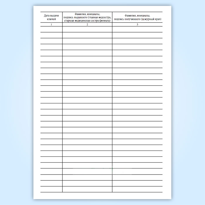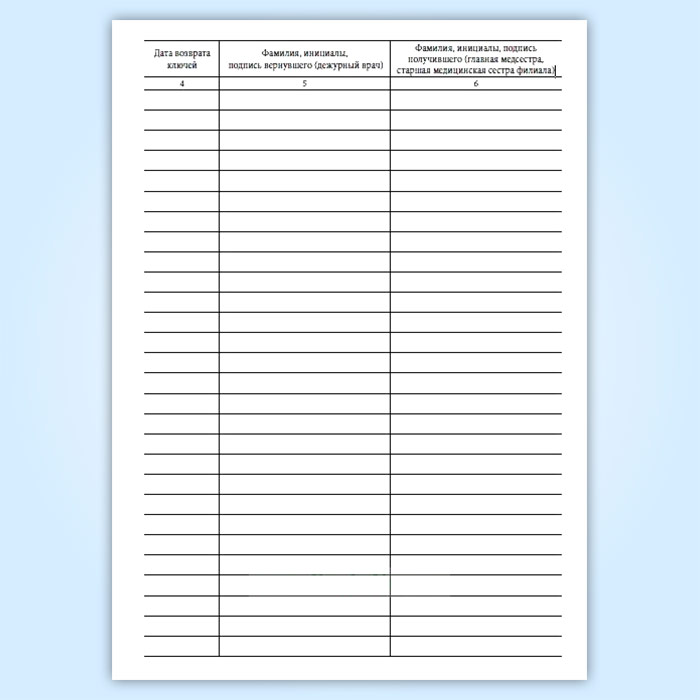 Журнал передачи ключей главной медсестры (старшей медицинской сестры филиала) дежурным врачам от помещения и сейфа, где проводятся операции, связанные с оборотом наркотических средств и психотропных веществ, в выходные и праздничные дни в амбулаторном отделении медицинской организации