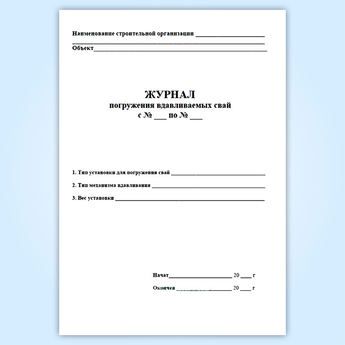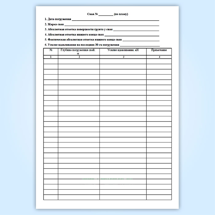 Форма журнала погружения вдавливаемых свай соответствует Приложению Д к Инструкции по проектированию и устройству свайных фундаментов зданий и сооружений, а также Приложению Д к СП 361.1325800.2017 Здания и сооружения. Защитные мероприятия в зоне влияния строительства подземных объектов