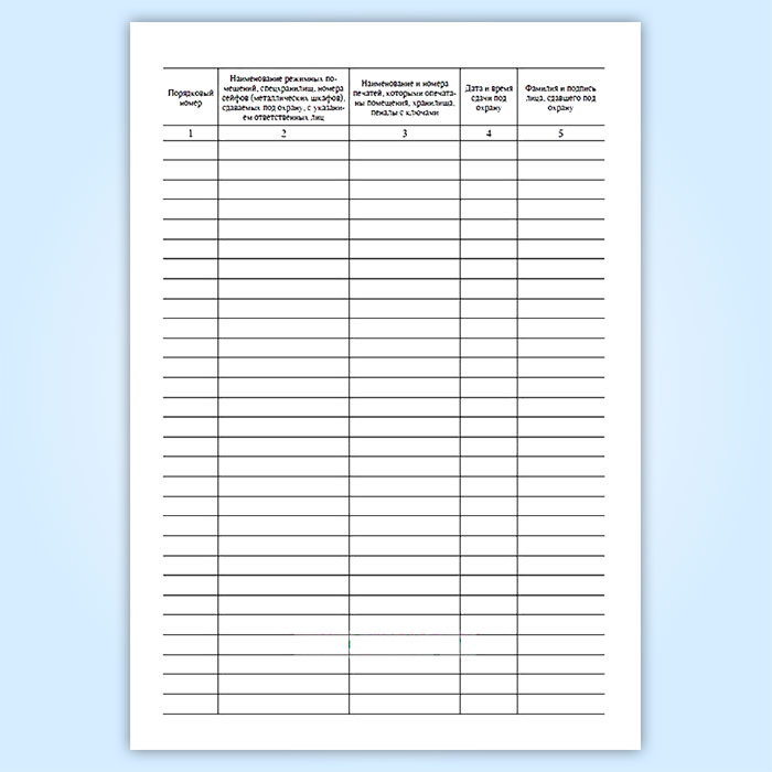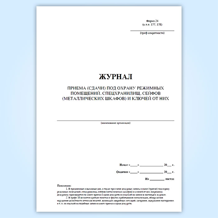 Форма журнала приема (сдачи) под охрану режимных помещений, спецхранилищ, сейфов (металлических шкафов) и ключей от них определена Приказом Минкультуры РФ от 25.08.2010 N 558 " Об утверждении " Перечня типовых управленческих архивных документов, образующихся в процессе деятельности государственных органов, органов местного самоуправления и организаций, с указанием сроков хранения" .