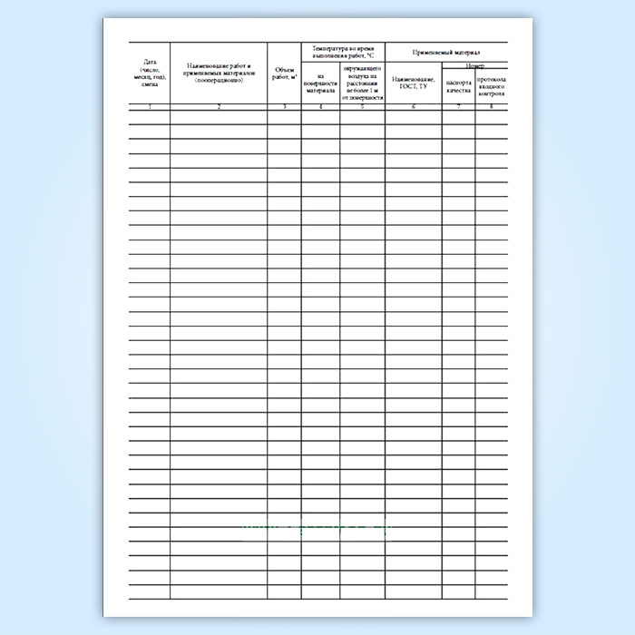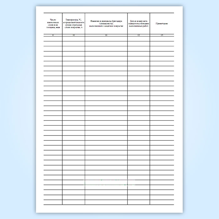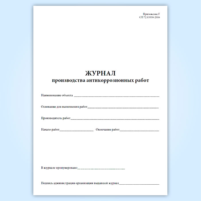 Форма журнала производства антикоррозионных работ соответствует Приложению Г к СП 72.13330.2016. Защита строительных конструкций и сооружений от коррозии Актуализированная редакция СНиП 3.04.03–85. Последняя редакция
