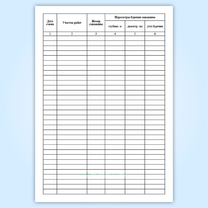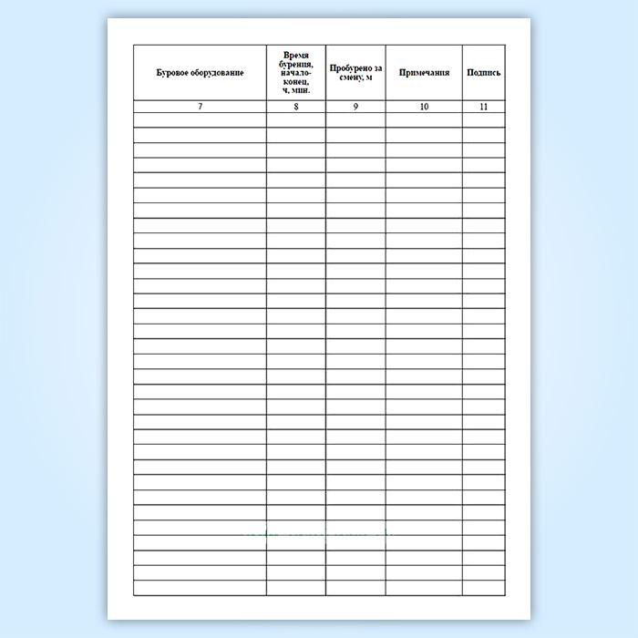 Форма журнала производства буровых работ соответствует Приложению 6.7.В1 к СП 32-105-2004. Метрополитены (одобрен Письмом Госстроя РФ от 23.03.2004 N ЛБ-1912/9).