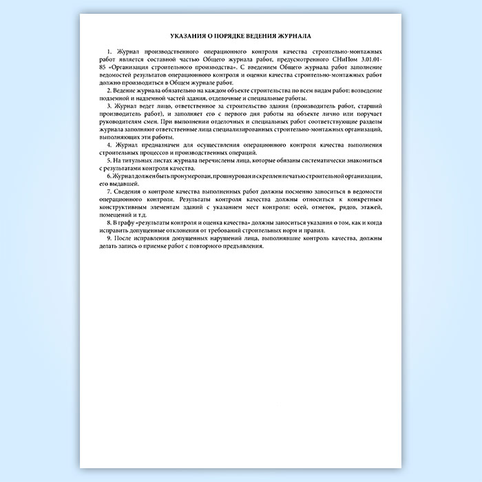 Журнал производственного операционного контроля качества строительно-монтажных работ является частью Общего журнала работ, предусмотренного СНиПом 3.01.01-85 «Организация строительного производства».