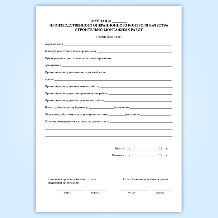 Ведение журнала производственного операционного контроля качества строительно-монтажных работ обязательно на каждом объекте строительства по всем видам работ: возведение подземной и надземной частей здания, отделочные и специальные работы. Журнал производственного операционного контроля качества строительно-монтажных работ ведет лицо, ответственное за строительство здания (производитель работ, старший производитель работ), и заполняет его с первого дня работы на объекте лично или поручает руководителям смен. При выполнении отделочных и специальных работ соответствующие разделы журнала заполняют ответственные лица специализированных строительно-монтажных организаций, выполняющих эти работы.
