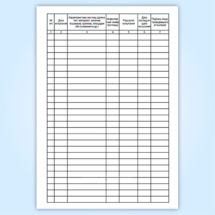 Дата и результаты периодических осмотров и испытаний лестниц и стремянок фиксируются в журнале регистрации и учета испытаний лестниц (приставных, стремянок).