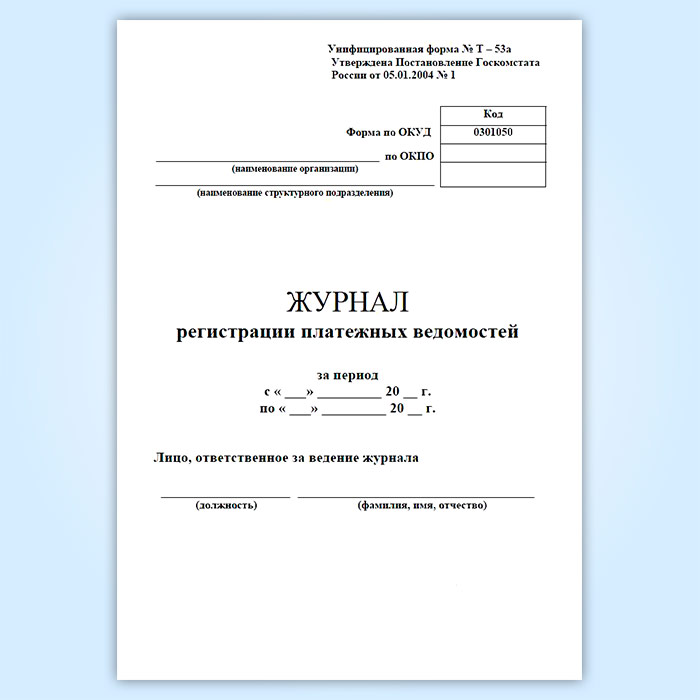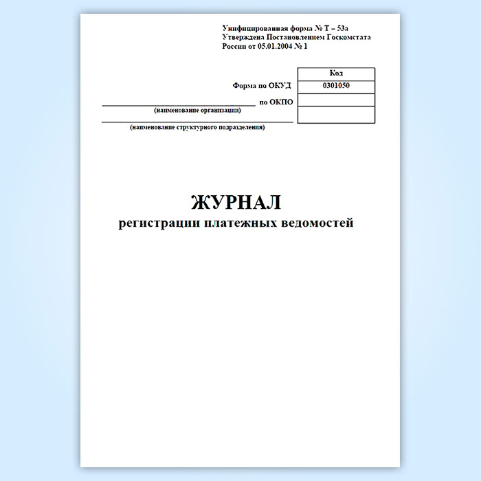 Журнал регистрации платежных ведомостей (Унифицированная форма № Т-53а, Форма по ОКУД 0301050) соответствует постановлению Государственного комитета Российской Федерации по статистике от 5 января 2004 г. №1 " Об утверждении унифицированных форм первичной учетной документации по учету труда и его оплаты"