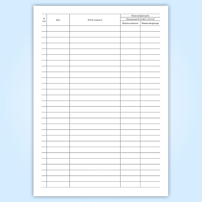 Предрейсовый инструктаж с водительским составом регистрируется в журнале регистрации предрейсового инструктажа водителей по безопасности дорожного движения и проводится с водителями, обеспечивающими междугородние и международные перевозки, перевозку детей, перевозку опасных, тяжеловесных и крупногабаритных грузов; с водителями, направляемыми на сельхозперевозки и в командировку, с водителями автобусов.