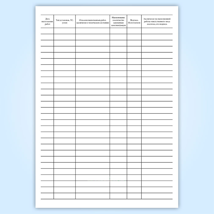 Форма журнала регистрации работ по техническому обслуживанию и ремонту автоматических установок пожаротушения соответствует обязательному Приложению 6 к РД 25.964-90 " Система технического обслуживания и ремонта автоматических установок пожаротушения, дымоудаления, охранной, пожарной и охранно-пожарной сигнализации. Организация и порядок проведения работ" .