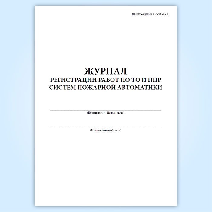 Форма журнала регистрации работ по ТО и ППР систем пожарной автоматики соответствует Приложению 1, Форме 4 Установки пожарной автоматики. Правила технического содержания.Руководящий документ РД 009-01-96