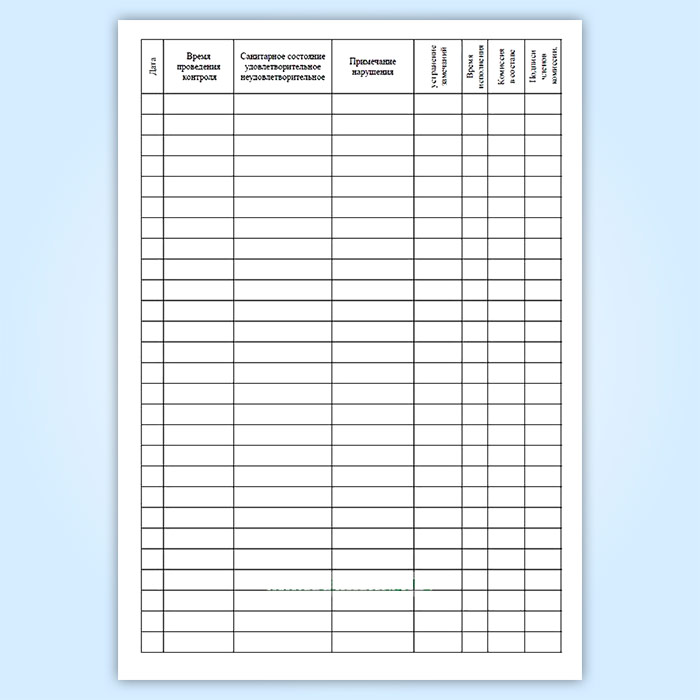 Контроль санитарного состояния помещений, а также сведения об устранении выявленных замечаний регистрируются в специальном журнале.