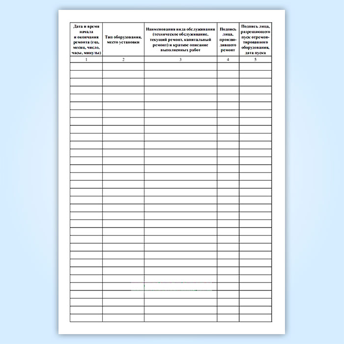 Форма журнала технического обслуживания и ремонта соответствует Приложению 11 к Радиотехническое обеспечение полетов воздушных судов и авиационная электросвязь. Федеральные авиационные правила .