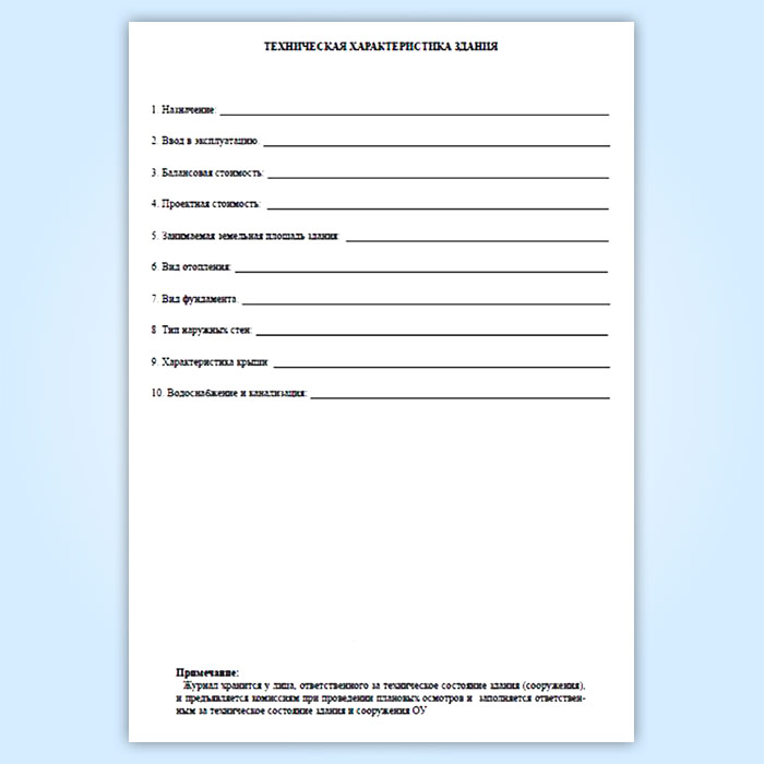 В журнал технической эксплуатации здания (сооружения) ГОУзаносятся данные о результатах наблюдений за зданием или сооружением и их конструктивными элементами, прогибов и других деформаций отдельных конструктивных элементов; основные заключения по результатам периодических осмотров здания и сооружения; основные данные о проведенных ремонтах (сроки, характер, объем); основные данные о проведенных реконструкциях (сроки, характер).
