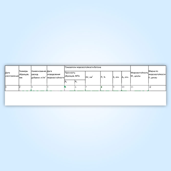 Журнал ускоренного определения морозостойкости бетона соответствует Приложению Г к "Межгосударственному стандарту.Бетоны. Структурно-механический метод ускоренного определения морозостойкости", разработанному Всероссийским научно-исследовательским институтом физико-технических и радиотехнических измерений (ВНИИФТРИ) Российской Федерации, внесенным Минстроем России и принятым Межгосударственной научно-технической комиссией по стандартизации и техническому нормированию в строительстве (МНТКС) 22 ноября 1995 г.