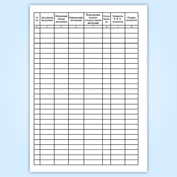 Форма журнала учета выдачи инструкций по охране труда для работников подразделений (служб) предприятия соответствует "ТОИ Р-97300-002-1995. Сборник типовых отраслевых инструкций по охране труда при ремонте и техническом обслуживании машин и оборудования в хозяйстве" (утв. Приказом Минсельхозпрода РФ от 23.11.1994 N 289) Приложение N 4. Форма журнала учета выдачи инструкций по охране труда для работников подразделениям (службам) предприятия, "Пособие по охране труда главному инженеру ДРСУ (ДЭП)" (утв. Распоряжением Минтранса РФ от 29.01.2003 N ОС-36-р), а также Приложению № 5 к "Правилам разработки, построения, оформления и обозначения нормативных документов по охране труда".