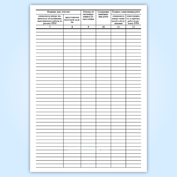 В журнале учета вызовов технических специалистов и регистрации выполненных работ (Форма КМ-8) делается запись об опломбировании оттиска клейма. В случае необходимости ремонта денежных контрольных счетчиков или электронной части контрольно-кассовой машины делается соответствующая запись и указывается руководству организации о необходимости направления контрольно-кассовой машины в ремонт в центр технического обслуживания. Соответствующая запись подтверждается подписями специалиста центра технического обслуживания и ответственного лица организации о приемке работ по ремонту ККМ.