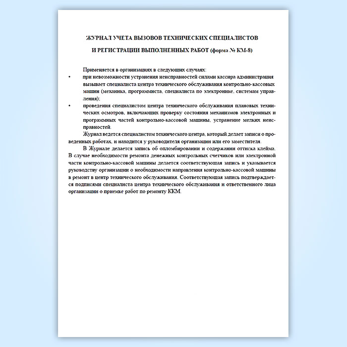 Журнал учета вызовов технических специалистов и регистрации выполненных работ (Форма КМ-8) находится у ответственного за его ведение сотрудника организации, на балансе которой находится ККМ. На лицевой стороне журнала ставится полное название организации, её адрес и номер телефона, модель ККМ и ее заводской номер, дата начала и окончания ведения журнала, фамилия, имя, отчество и должность лица, ответственного за ведение журнала.