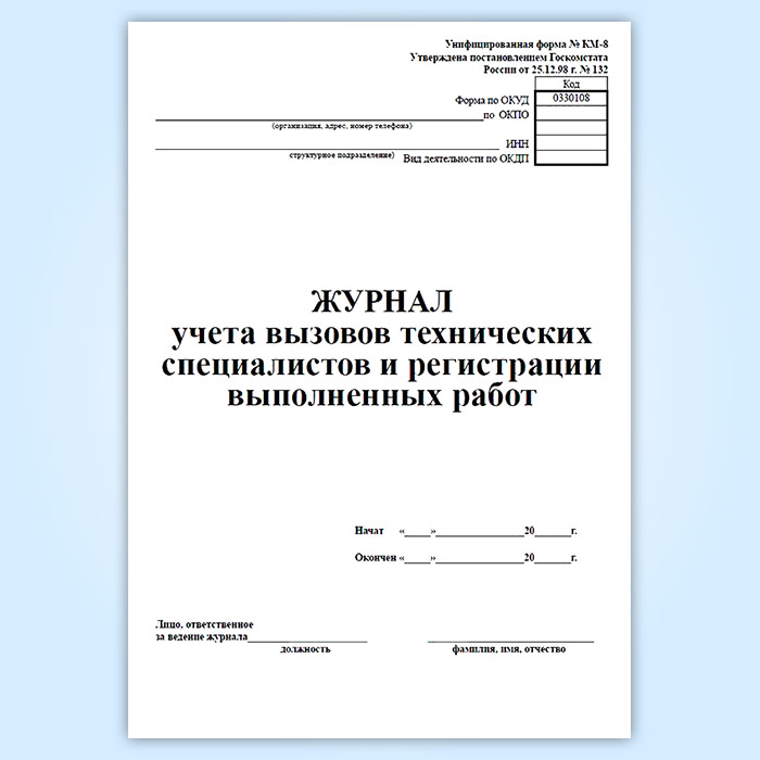 Журнал учета вызовов технических специалистов и регистрации выполненных работ (Форма КМ-8) соответствует Постановлению Госкомстата РФ от 25.12.1998 № 132 " Об утверждении унифицированных форм первичной учетной документации по учету торговых операций"