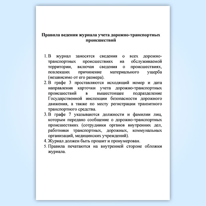 Журнал учета дорожно-транспортных происшествий должен быть прошнурован, пронумерован, подписан руководством предприятия и скреплен печатью.