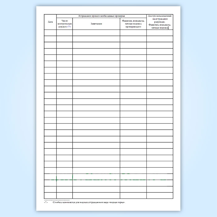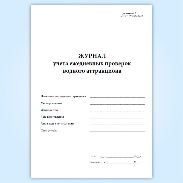 Форма журнала учета ежедневных проверок водного аттракциона соответствует приложению В к ГОСТ Р 52604-2012 Аттракционы водные. Безопасность при эксплуатации. Общие требования