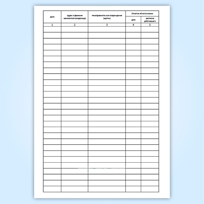 Форма журнала учета заявок населения на оперативное устранение неисправностей и повреждений инженерного оборудования в жилом доме (электротехнические работы) соответствует Постановлению Госстроя РФ от 27.09.2003 N 170 " Об утверждении Правил и норм технической эксплуатации жилищного фонда"