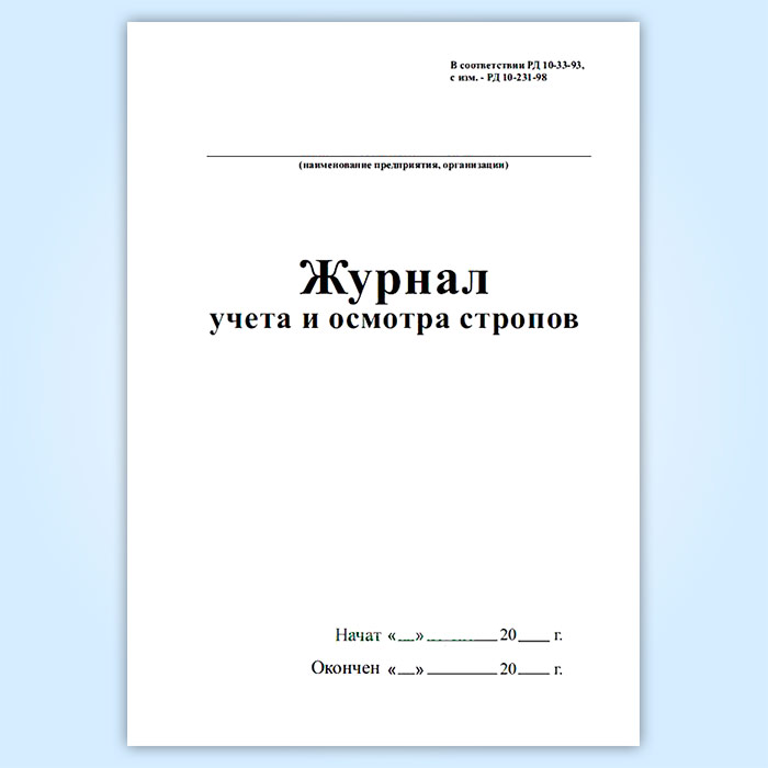 Форма журнала учета и осмотра стропов соответствует Приложению 5 к РД-10-33-93 Стропы грузовые общего назначения. Требования к устройству и безопасной эксплуатации, Приложение Б к Типовой инструкции по безопасной эксплуатации текстильных ленточных стропов (РД 220-14-98), ТИ Р М-007-2000. Типовая инструкция по охране труда для стропальщиков и некоторым др. нормативным документам.
