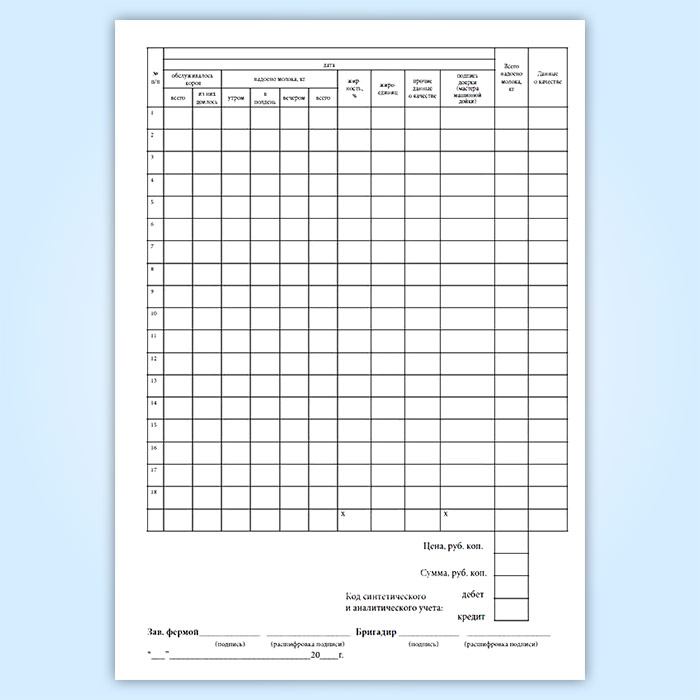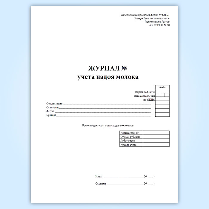 Журнал учета надоя молока (Форма № СП-21) соответствует Постановлению Госкомстата РФ от 29.09.1997 № 68 " Об утверждении унифицированных форм первичной учетной документации по учету сельскохозяйственной продукции и сырья"