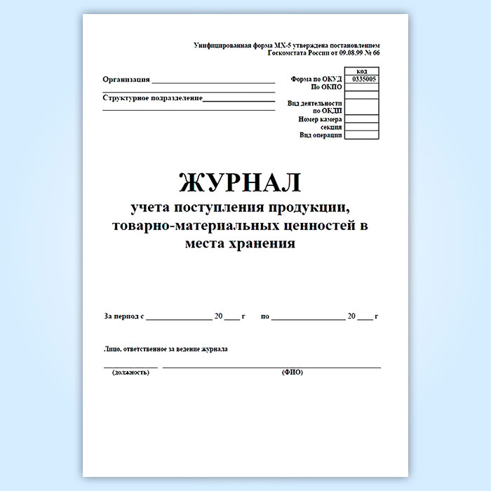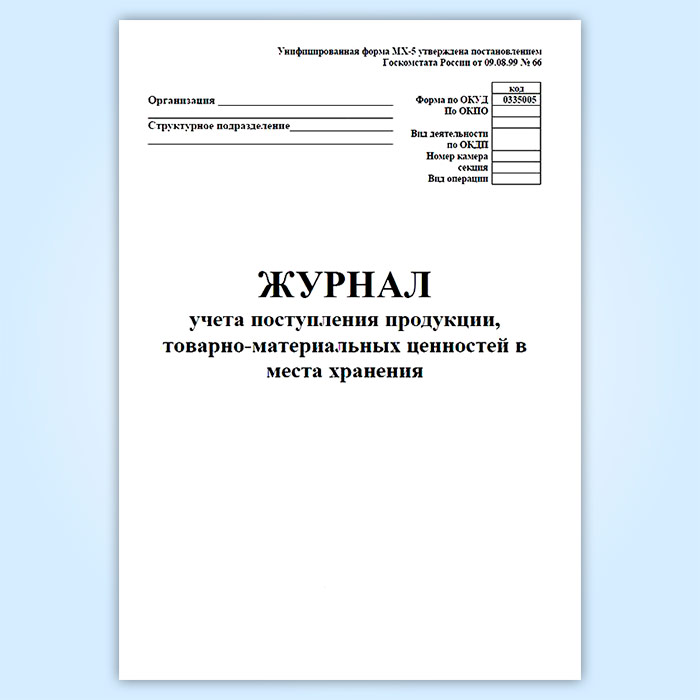 Журнал учета поступления продукции, ТМЦ в места хранения форма МХ-5 соответствует Постановлению Росстата от 09.08.1999 № 66 " Об утверждении унифицированных форм первичной учетной документации по учету продукции, товарно-материальных ценностей в местах хранения"