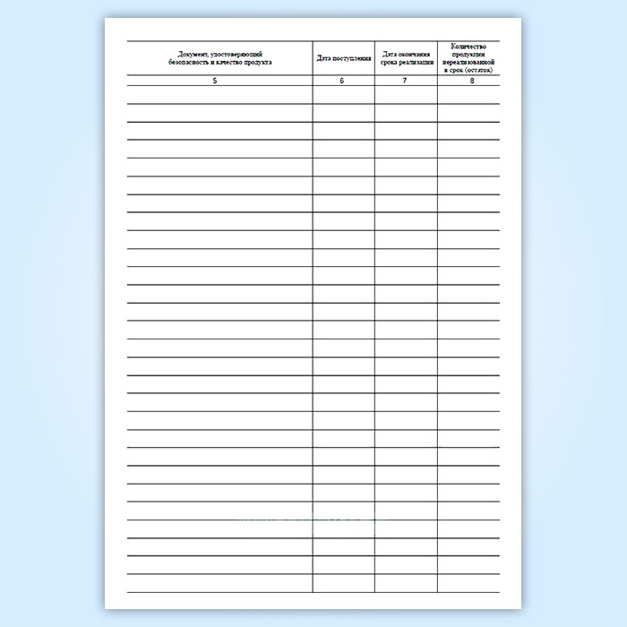 Журнал учета поступления сырья и продуктов животного происхождения (масла и мясопродуктов, мяса птицы и яиц, рыбы и рыбопродуктов, продуктов моря и пчеловодства), поступающих на предприятия торговли имеет графы:
