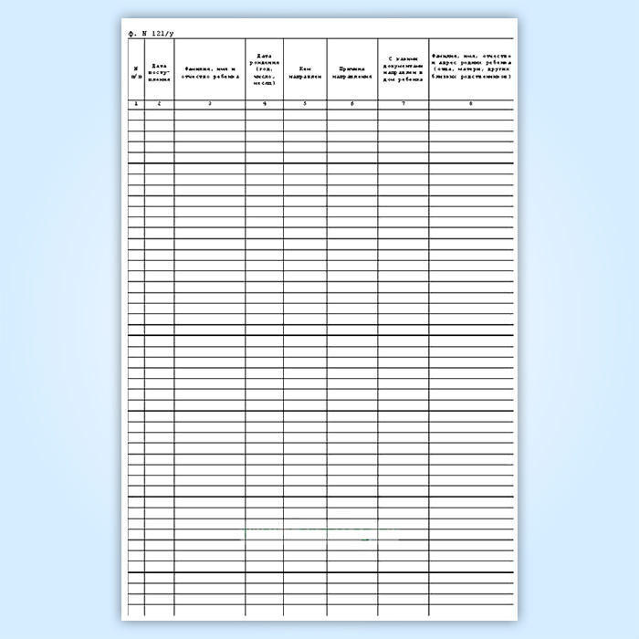 Журнал учета приема детей в дом ребенка (Форма 121/у), утвержден Приказом Минздрава СССР №1030 «Об утверждении форм первичной медицинской документации учреждений здравоохранения» от 4 октября 1980 г..