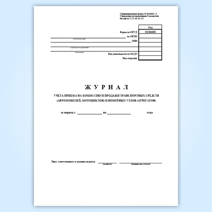 Журнал учета приема на комиссию и продажи транспортных средств (автомобилей, мотоциклов) и номерных узлов (агрегатов) (Форма № КОМИС-8) соответствует Постановлению Госкомстата РФ от 25.12.1998 № 132 "Об утверждении унифицированных форм первичной учетной документации по учету торговых операций"