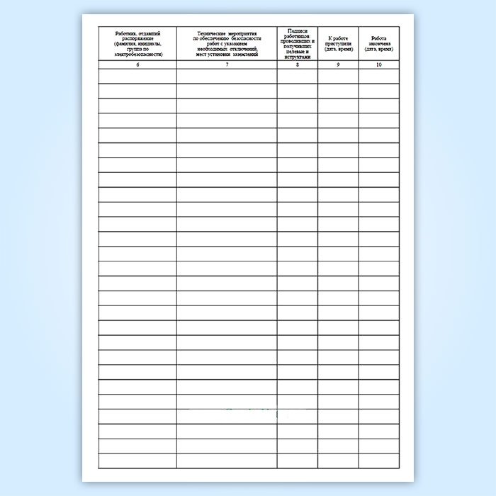 При работах по нарядам в журнале оформляется только первичный допуск к работам и указываются номер наряда, место и наименование работы, дата и время начала и полного окончания работы (графы 2, 3, 9 и 10); при работах по распоряжению должны быть оформлены все графы журнала, за исключением графы 2 (номер наряда).