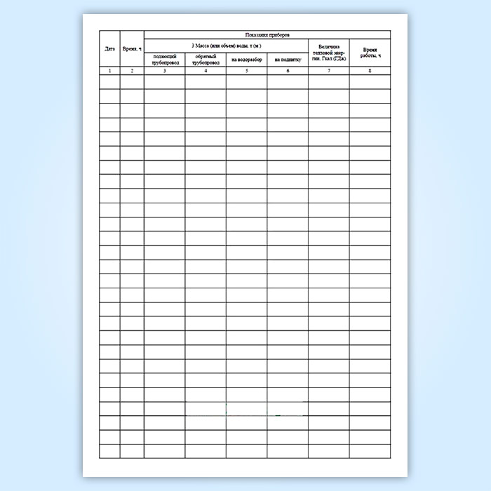 Форма журнала учета тепловой энергии и теплоносителя у потребителя в водяных системах теплопотребления соответствует Приложению 7 к Правилам учета тепловой энергии и теплоносителя.