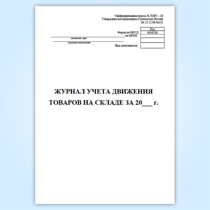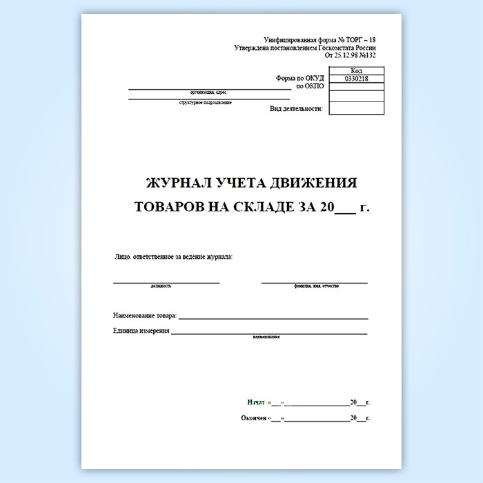 Журнал учета товаров на складе (Форма ТОРГ-18) соответствует Постановлению Госкомстата РФ от 25.12.1998 № 132 "Об утверждении унифицированных форм первичной учетной документации по учету торговых операций"