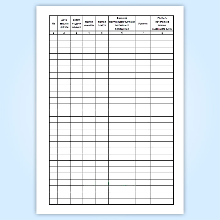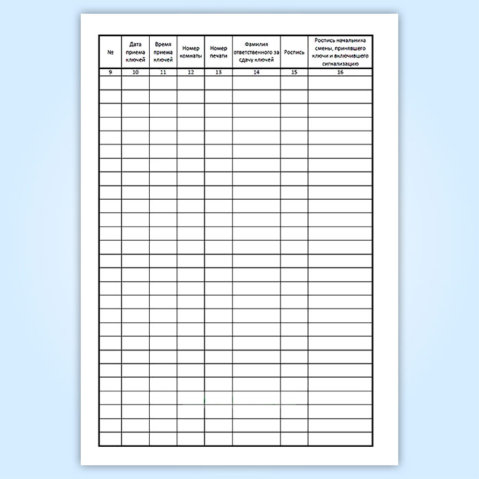 Форма журнала учета, выдачи и приема ключей не является унифицированной, однако часто применяется на постах охраны, где хранятся ключи.